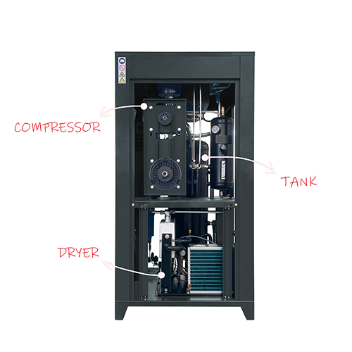 - Compact all-in-one system includes a rotary screw industrial air compressor, refrigerated or modular desiccant air dryer, and filters and storage tank in a robust protective case.